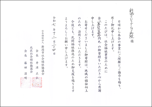 2025年11月9日開催の病院祭で行われたチャリティーフリーマーケットの売上金を新潟市北区社会福祉協議会に寄付させて頂きましので、ご報告申し上げます。